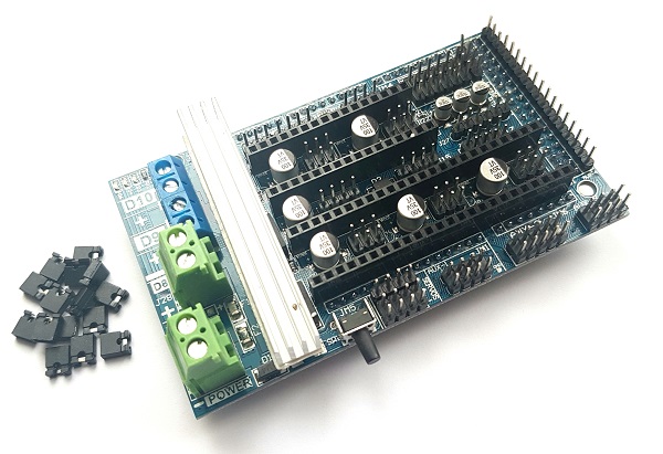 Arduino Mega kompatibles Board + RAMPS 1.6 Shield, Nachfolger des RAMPS 1.4 mit verbesserten Endstufen und dessen Kühlung (inkl. Kühlkörper). Ebensfalls werden beim RAMPS 1.6 die Klemmanschlüsse für das Heizbett separat ausgeführt. Dazu noch die passende Anzahl an Jumpern zur Einsellung der Schritte der Treiber. |