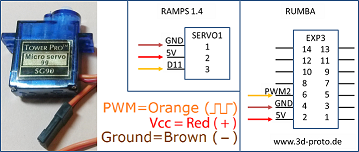 Während beim RAMPS 1.4-Board eine der Servo-Pinreihe direkt genutzt werden kann (5V muss hierbei