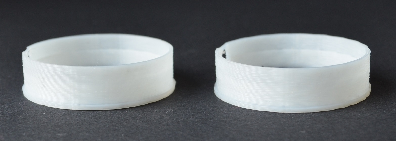 Der rechte Druck besitzt wellenförmigen Muster am Rand und die Layer sind gegenüber dem linken Druck unpräziser gedruckt.